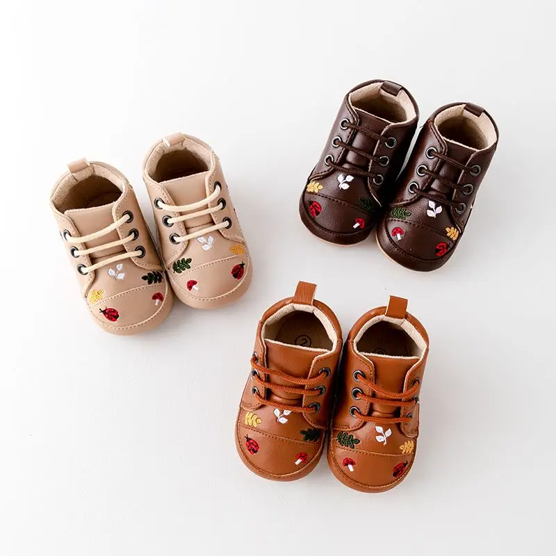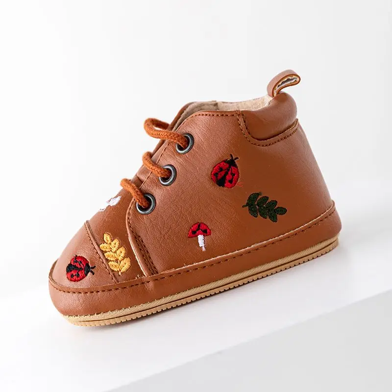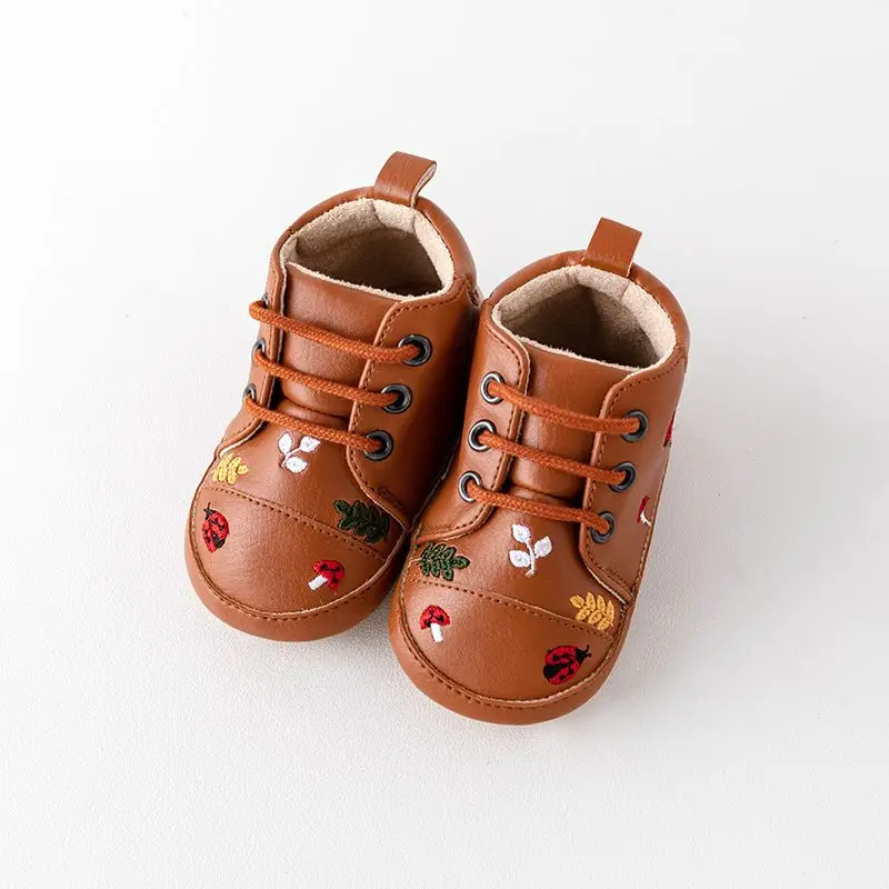 Spring and Autumn Pu Leather Cartoon Embroidered Baby High Top Front Elastic Casual Toddler Shoes